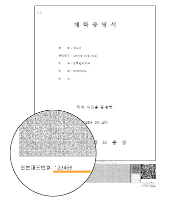 - 발급된 문서하단에 2차원 바코드가 출력된 증명서인 경우 바코드 검증 프로그램으로원본대조 할수 있습니다